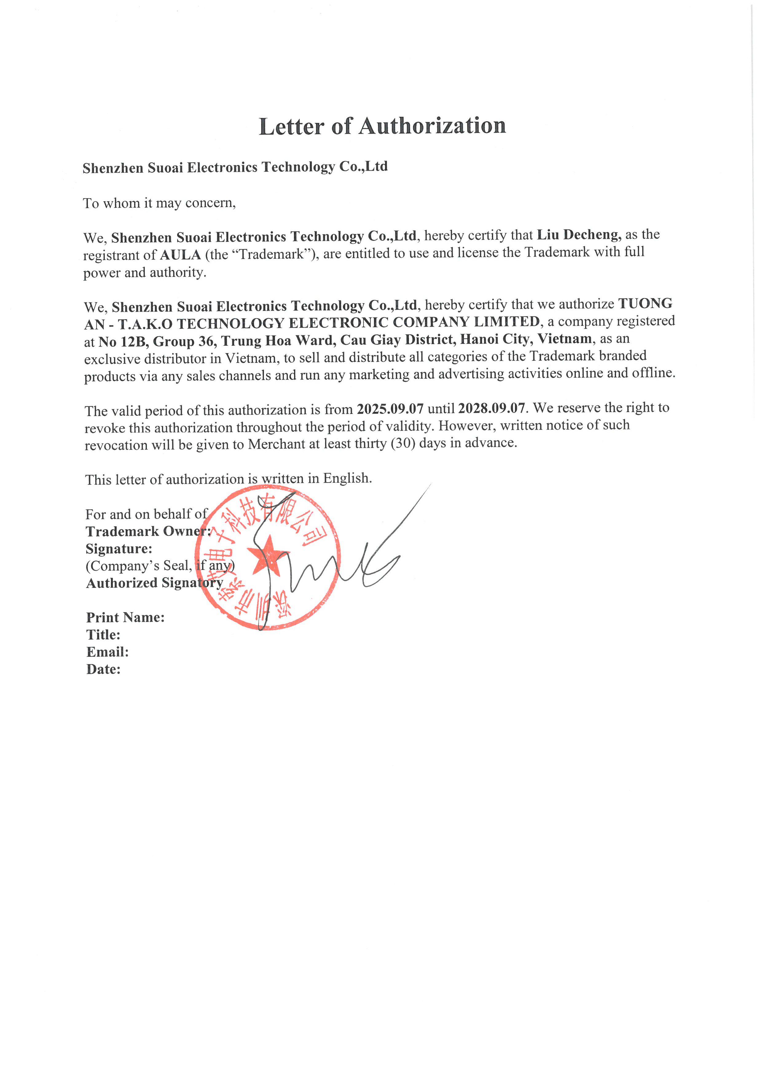 Chứng Nhận Nhà Phân Phối Độc Quyền Lecoo/Aula tại Việt Nam