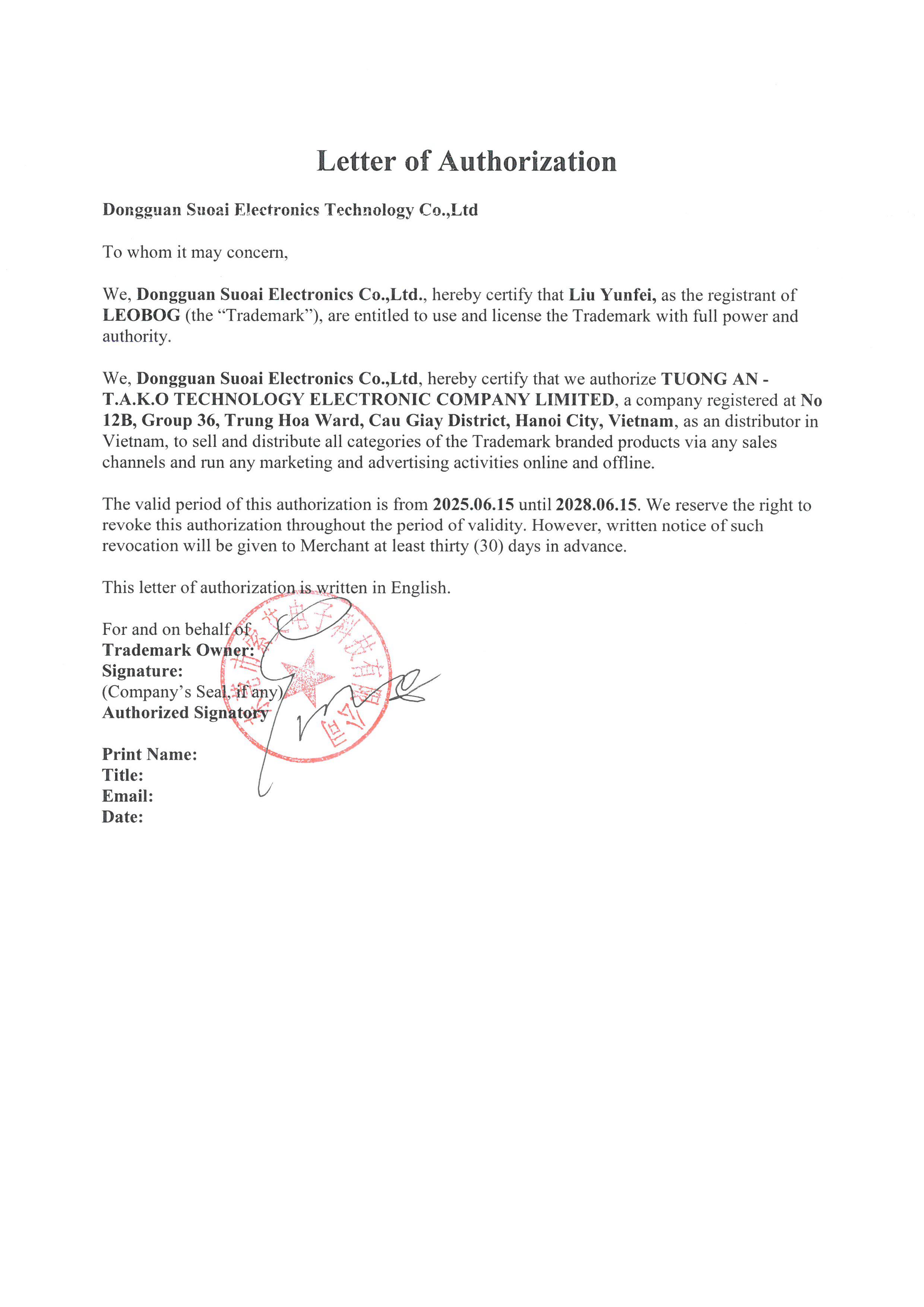 Chứng Nhận Nhà Phân Phối Leobog Tại Việt Nam